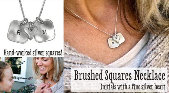 Our August Necklace of the Month is a great choice if you're looking for an initials necklace, but want something a little different from classic circle charms. We take our sterling silver squares and stamp them with your choice of initials. Then, we hand -work them to add a slight curve for additional character and depth, and carefully brush them to a lovely matte finish. Next, we add a hand molded fine silver heart charm as an accent, and hang them all on a sterling silver chain. The final piece has a beautiful silver luster, and a warm, handmade feel.
